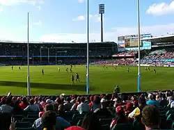 The first Victorian Football League match played in Sydney was with Fitzroy Football Club 7–10, defeating the Collingwood Football Club 6–9 at the Sydney Cricket Ground on 24 May 1903.[45] The large attendance of 20,000 saw the exhibition hailed as a success and inspired the league to continue scheduling more matches in Sydney. However, follow-up matches quickly began to attract cynicism from the Sydney football public, as a VFL push when Geelong Football Club 8.7 (55) defeated Carlton Football Club 6.9 (45) at the SCG a few months later. The matches were seen by the Sydney media as an attempt to force-feed the Victorian game to Sydneysiders who had plenty of rugby to attract their ongoing interest. The crowd of 5,000 was much smaller than those of rugby games in the city.[46] In 1904, Melbourne Football Club 9–17 (71) defeated Essendon Football Club 6–3 (39) in front of 6,000 people.[47] Without any interest, top-level VFL disappeared from Sydney for decades.