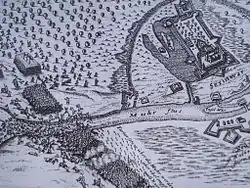 The Ottoman grand vizier aimed to force the Habsburg troops into battle and marched on Zrinski's stronghold Novi Zrin. His army besieged and conquered the fortress after Montecuccoli refused a relief attack with inferior numbers and retreated to the Rába river.[2]