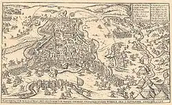 On the eastern front of the war, Michael the Brave, prince of Wallachia, started a campaign against the Ottomans in the autumn of 1594, conquering several castles near the Lower Danube, including Giurgiu, Brăila, Hârşova, and Silistra, while his Moldavian allies defeated the Ottoman armies in Iaşi and other parts of Moldova.[27] Michael continued his attacks deep within the Ottoman Empire, taking the forts of Nicopolis, Ribnice, and Chilia,[28] and even reaching as far as Adrianople.[29] At one point his forces were only 24 kilometres (15 mi) from the Ottoman capital, Constantinople.