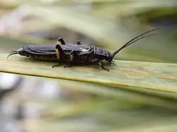 This distinctive warning coloration is mimicked by melanic specimens of the non-toxic stoneflies Zelandoperla fenestrata and Taraperla pseudocyrene.[1][5]