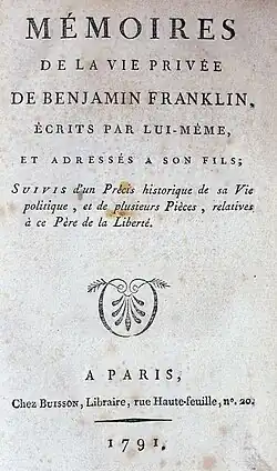 - Franklin, Benjamin. Mémoires de la vie privée de Benjamin Franklin écrits par lui-méme, et adressés a son fils; suivis d'un précis historique de sa vie politique, et de plusieurs pièces, relatives à ce père de la liberté. Translated by Jacques Gibelin. Paris: F. Buisson Libraire, 1791.