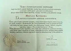 In 1945, the Prague collections of the Nostitz family, along with the autograph of De revolutionibus, were nationalized.[20] Eleven years later, on 5 July 1956, the government of Czechoslovakia offered this artifact as a gift to the Polish nation.[20]