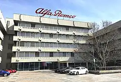Museo Alfa Romeo ('Alfa Romeo Historical Museum') is Alfa Romeo's official museum, located in Arese (Milan), and displaying a permanent collection of Alfa Romeo cars and engines. After being closed down in 2011, the museum reopened in June 2015.[54] The museum was officially inaugurated on 18 December 1976,[55][56] and is located in the former Alfa Romeo Arese factory area. Production of cars ended in 2002 and engine production in 2006 in Arese factory complex. At the beginning of 2009 the museum was closed down a first time for renovations and opened in the end of the year, to celebrate Alfa Romeo's 100th birthday in 2010. It was closed once more in February 2011, reportedly for renovation work again.[57] The renovation project was laid down at the end of 2013, and restoration work only started in Summer 2014.[54] Centerpiece of the renewed structure are Alfa red projecting roofs added to the original 1970s structure.[54] After four years the Museum officially reopened on 24 June 2015, when it hosted the press unveiling of the all-new Alfa Romeo Giulia and Alfa Romeo logo, both key steps in the relaunch of the brand.[54] On 30 June 2015 the museum reopened to the public.[54] The museum is dedicated to over 100 years of history of the Alfa Romeo marque, whose production included automobiles, commercial vehicles, railway locomotives, tractors, buses, trams, marine and aircraft engines. The museum spreads over 4,800 square metres (52,000 sq ft). Its six floors are divided into four theme areas, including a historical review of all Alfa Romeo road cars produced since 1910, prototypes and dream cars, aircraft and aeronautical projects, and scale models and awards. The museum collection numbers over 250 cars and 150 engines, of which approximately half were on display. These included at least one example of each model produced, plus prototypes and racing cars.[55] Some of the museum cars are regularly on loan for festivals and historical events, like Pebble Beach Concours d'Elegance, the Goodwood Festival of Speed and Mille Miglia.