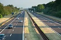 By 2016 the work for the realisation of the third motorway lane in the segment between Verona Nord toll booth and the intersection with highway A1 in Modena Nord had begun. In this last section, the interchange will be enlarged enough to satisfy the needs of the constantly rising traffic. Moreover, it will be already prearranged for the future add-on towards Sassuolo (through a beltway). For this extension of the motorway, no land expropriations are planned to be brought. Instead, the already present 11 meters of central reservation between the two carriageways will be used. This intervention also provides for the widening of the hard shoulder of about one meter. Furthermore, it is planned the building of lay-by stopping places every 500 meters.[9][10]
