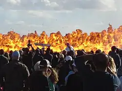 The wall of fire display was not present this year, out of respect to the many people affected by the Victorian bushfires. The show donated $250,000 to fund research into aviation technology aimed at bushfire management.[19] Much of the Sunday show was cancelled due to severe weather, with several tents and temporary structures blown away by strong winds and extensive damage to some visiting aircraft. In total, 562 aircraft part took in the show, with an attendance of 170,045 during the entire show.[20] Ticket sales were the same as 2007 despite the windy and rainy weather.[19]