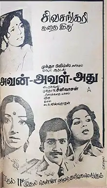 Avan Aval Adhu (transl. He, she and that)[1] is a 1980 Indian Tamil-language film directed by Muktha Srinivasan and written by Visu.[2] The film stars Sivakumar, Lakshmi, Sripriya and Thengai Srinivasan. Dealing with the then-groundbreaking issue of surrogate pregnancy in India, it is based on the story Oru Singam Muyalaagirathu (transl. A lion becomes a rabbit) by Sivasankari.[3][4] The film was released on 11 April 1980.[5]