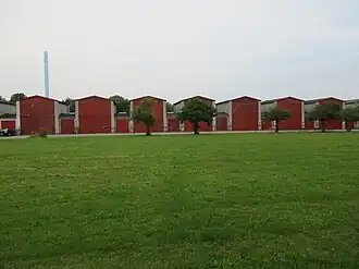 The two red painted hangars from 1917 were listed in 1976.[1] They were constructed in timber so that they could easily be burned down in the event of war. The site also features an engine testing facility from 1943. Almost a hundred metres long, it consists of a row of 10 interconnected testing halls. A vintage aircraft from 1958 has been installed on the top of a column in front of the buildings.