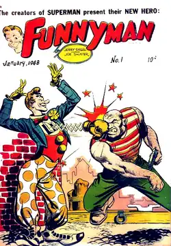 In late 1947, Superman creators Jerry Siegel and Joe Shuster collaborated once again with editor Vin Sullivan, who had worked with the writer-artist team during their nascent days freelancing for National Allied Publications, the future DC Comics. The duo had decamped to Magazine Enterprises after leaving National Allied (by then called National Comics) and suing to regain the rights to Superman and their later creation, Superboy. Siegel and Shuster brought most of their studio's artists with them, except for 1950s Superman penciler Wayne Boring, and created the new character Funnyman, a slapstick-comedian hero. Both as a comic book and as a comic strip, however, the character failed to find an audience.[1]