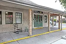 The main entrance is the station house on the east side of the tracks, adjacent to the northbound platform on the south side of Avenue H.[39] Designed in a similar Colonial Revival and Queen Anne style to the neighborhood's residences, the station house is one story high and contains wooden shingles on its facade.[3]: 1 The pyramidal roof is covered in asphalt shingles and has a brick corbelled chimney. A portico with peeled-log wooden posts wraps around the station house, with overhanging eaves.[3]: 3–4 The station house, designated by the New York City Landmarks Preservation Commission as a city landmark in 2004, is the only such structure in the New York City Subway system that was not originally intended as a rapid transit facility.[3]: 1 [15]