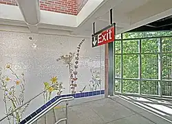 The 2011 artwork here is called Brooklyn Wildfires by Jason Middlebrook and Miotto Mosaic Art Studio. It is installed on the walls of the Coney Island-bound platform's staircase and consists of ceramic tiling and glass mosaic depicting various species of wildflowers.