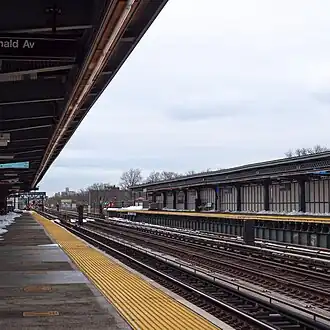 As part of Contract 4 of the Dual Contracts, between the city and the BRT, a three-track elevated railway was built above the surface Culver Line from the Fifth Avenue Elevated southeast and south to Coney Island.[3] The Culver Line was operated as a branch of the Fifth Avenue Elevated, with a free transfer at Ninth Avenue to the West End Line into the Fourth Avenue Subway.[4][5][6][7] Avenue U station opened as the line was extended from Kings Highway at noon on May 10, 1919.[8][9][10]