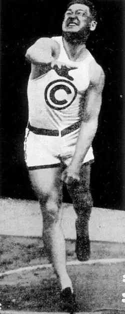 Brundage had been successful in several track and field events while at Illinois. In 1910, as a member of the Chicago Athletic Association (CAA), he finished third in the national all-around championships (an American predecessor of the decathlon), sponsored by the Amateur Athletic Union (AAU), and continued training, aiming at the 1912 Olympics in Stockholm.[8] At Stockholm, Brundage finished sixth in the pentathlon and 16th in the decathlon.[9] Far behind on points, after eight events he dropped out of the decathlon, which he always regretted. He later moved up one spot in the standings in each event when his fellow American, Jim Thorpe, who had won both events, was disqualified after it was shown that he had played semi-professional baseball: this meant Thorpe was considered a professional athlete, not an amateur as was required for Olympic participation. Throughout his tenure as president, Brundage refused to ask the IOC to restore Thorpe's medals despite advocacy by Thorpe supporters. The committee eventually did so in 1982, after the deaths of both men. Brundage's refusal led to charges that he held a grudge for being beaten in Stockholm.[10][11][12]