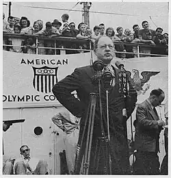 Brundage led the contingent of American athletes and officials who embarked for Hamburg on the S.S. Manhattan at New York Harbor on July 15, 1936.[42] Immediately upon arrival in Germany, Brundage became headline news when he and the AOC dismissed American swimmer Eleanor Holm, who was a gold medalist in 1932 and expected to repeat, for allegedly getting drunk at late-night parties and missing her curfew. There were various rumors and accounts of the married swimmer's pursuits while on board the ship; the gossip included statements that she was at an "all-night party" with playwright Charles MacArthur, who was traveling without his wife, actress Helen Hayes.[43][44] Brundage discussed the matter with fellow AOC members, then met with Holm.[43] Although the AOC attempted to send her home, Holm pleaded in vain for reinstatement; "to the AOC's horror," she remained in Berlin as a journalist,[43] watching from the stands as the gold medal went to Dutch swimmer Nida Senff. Decades later, Holm told Olympic sprinter Dave Sime that Brundage had held a grudge against her, having propositioned her, and she turned him down.[45] According to Guttmann, "Brundage has appeared, ever since [1936], in the guise of a killjoy."[46] Butterfield noted that through the efforts of sportswriters who supported Holm, "Brundage became celebrated as a tyrant, snob, hypocrite, dictator and stuffed shirt, as well as just about the meanest man in the whole world of sports."[47]