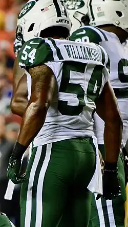 On March 18, 2018, the New York Jets signed Williamson to a three-year, $22.50 million contract that includes $16 million guaranteed and a signing bonus of $6 million.[32][33][34][10] Williamson entered training camp slated as a starting inside linebacker. Head coach Todd Bowles named Williamson and Darron Lee the starting inside linebackers to begin the season, alongside outside linebackers Josh Martin and Jordan Jenkins.[35] On September 20, 2018, Williamson collected a season-high 14 combined tackles (eight solo) and made two sacks during a 21–17 loss at the Browns in Week 3. In Week 6, Williamson made five solo tackles, a season-high three pass deflections, and intercepted a pass by Andrew Luck in the Jets’ 42–34 win against the Indianapolis Colts.[36] Williamson started in all 16 games in 2018 and recorded a career-high 120 combined tackles (80 solo), six pass deflections, three sacks, and one interception.[16]