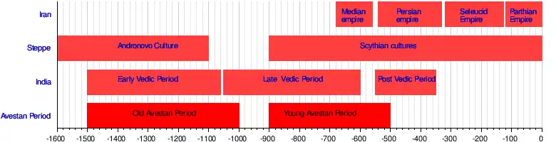 - Approximate timeline of the Avestan period (estimates according to Prods Oktor Skjaervo[37]) vis-a-vis several regions inhabited by Indo-Iranian peoples from 1500 BCE to 0 CE. The range for the Old Avestan period represents an uncertainty range rather than a duration, i.e., Zarathustra and his immediate followers may have lived sometime during the indicated time frame.