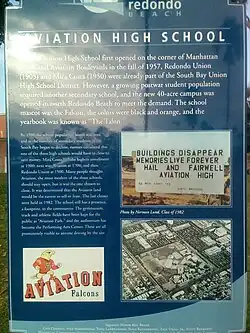 In 1982, Aviation's non-graduating students were sent to Redondo Union High School and Mira Costa High School, depending on their residence location[4] (to avoid overcrowding at Redondo High School, Mira Costa High School's resident limits were extended outside of Manhattan beach to incorporate part of Redondo Beach).