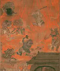 Avīci or Avici (Sanskrit and Pali for "without waves") is one of the hells (naraka) in Hinduism and Buddhism. In Hinduism, it is one of the twenty-eight hells located in the kingdom of Yama, where individuals are reborn for bearing false witness and outright lying while transacting business or giving charity.[1] In Buddhism, it is the lowest level of the Naraka or "hell" realm, with the most suffering, into which the dead who have committed grave misdeeds may be reborn.[2] It is said to be a cube 20,000 yojanas (240,000 to 300,000 kilometers [149129.1 to 186411.4 miles]) on each side, buried deep underneath the divine (non-visible) earth.[3] Avīci is often translated into English as "interminable" or "incessant", referring to suffering without periods of respite, although it is believed to be ultimately impermanent.