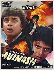 Avinash is a 1986 Hindi-language Indian action thriller film directed by Umesh Mehra, starring Mithun Chakraborty, Parveen Babi, Poonam Dhillon, Prem Chopra, Tom Alter, Avtar Gill and Sujit Kumar. Mithun Chakraborty dancing to the title card was a huge rage those days. In fact, no other movie ever attempted to show their hero dancing in front of the "Title Card".