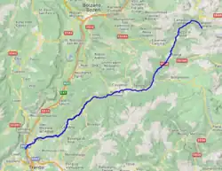 It rises from Marmolada and runs through the Fascia Valley, the Fiemme Valley and the Cembra Valley before joining the Adige in the town of Lavis, a small town 8 kilometres (5 mi) north of Trento.
