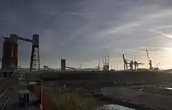 The docks, as seen from St Andrews Road. The coal loading silos can be seen on the left, with the Avonmouth container terminal on the right | |