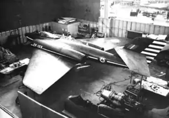 In 1951, the Canadian Department of Trade and Commerce issued an order for two prototypes and a static test airframe, under the CF-103 project designation. Jigs, tools and detailed engineering drawings were in place by June 1951, with wind tunnel testing, conducted at Cornell University, completed by November 1951.[3] Although a wooden mock-up of the CF-103 was built, along with a separate cockpit area and engine section that was partially framed in, the mock-up did not feature an undercarriage unit nor any interior fittings.[8] Two different tail designs were fitted with the initial effort only having a swept leading edge of the tail, while the definitive version had a much more raked appearance.[7] The engineering and installation requirements for the CF-103's proposed Orenda 17 jet engines were not finalized, as the experimental "hybrid" using an Orenda 8 compressor unit and Orenda 11 two-stage turbine, matched to a "reheat" unit, had not been fully developed.[N 3]