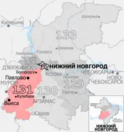 The Avtozavodsky constituency (No.131[a]) is a Russian legislative constituency in Nizhny Novgorod Oblast. Until 2007 the constituency covered Avtozavodsky, Leninsky and Sovetsky City Districts of Nizhny Novgorod. In 2016 Avtozavodsky constituency only retained Avtozavodsky City District but it took Pavlovo from former Dzerzhinsk constituency and Vyksa from former Arzamas constituency.