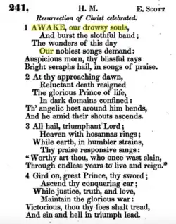 The authorship of "Awake, ye saints, awake" is ascribed to Cotterill, on the ground that he wrote the most of what is its present form. In Caleb Evans's Collection, fifth edition, 1786, it appears in five stanzas, commencing, “Awake, our drowsy souls." Rippon has it with the same text and the same title: “A Hymn for the Lord’s Day Morning." Evans credits it to “D,” that is, Dr. Philip Doddridge, but Dobell, who reprints it in six stanzas, has assigned it to “Scott”. It was altered about the year 1810 by Cotterill, for his Sheffield collection. The original was discovered in manuscript, in the library of Yale College, where it remained. Professor Frederic Mayer Bird gave much care to Scott's biography and hymns, and elaborately annotated this manuscript volume in the columns of the New York Independent. [2]