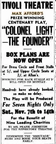 Paul O'Loughlin, who was head of drama at the ABC, made his Sydney stage debut as Colonel Light.[15] Henry Krips wrote the music. It was the only Australian play in the National Theatre Movement Rally.[16]