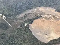 ![]() Awapoto River (left) flowing into the Awaroa Inlet; Awaroa Road (far left) is also visible | |