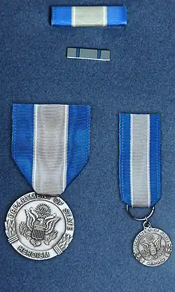 The Award for Heroism is an award of the United States Department of State. It is presented to employees of State, USAID and Marine guards assigned to diplomatic and consular facilities in recognition of acts of courage or outstanding performance under unusually difficult or dangerous circumstances, whether or not in connection with the performance of assigned duties.[1]
