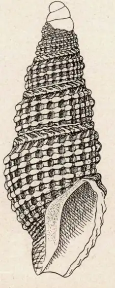 Sculpture: The spire-whorls contain three spiral equidistant cords, which are crossed by longitudinal also equidistant threads, forming small beads at the intersections, and squarish interstitial depressions. There are about twenty-one beads on a row. On approaching the base the spirals are getting narrower than the interspace, and the beading less prominent. Upon the beak there are small irregular threads crossed obliquely by the plications of the old beaks.
