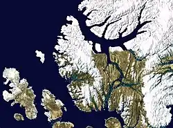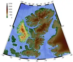 ![]() Shaded relief map of Axel Heiberg Island. Note that the colours are indicative of elevation, not foliage or ground cover. | |