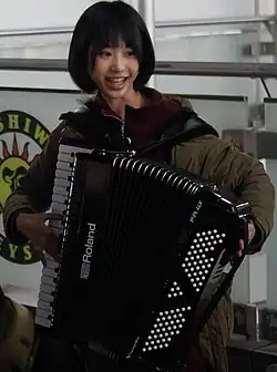 As recommended by her mother, she entered and passed the audition for the first generation students of the TV show, "Seishun Kōkō 3-nen C-gumi", produced by Yasushi Akimoto and TV Tokyo, in 2018 during her high school days.[5][6][7][8][9] About a month later, as part of club activities in the program, she joined the light music club called "Hey! school" and became a keyboard player.[10] They subsequently formed a new band "Chikyū no oto", which means "Sound of the earth" in Japanese.[11]