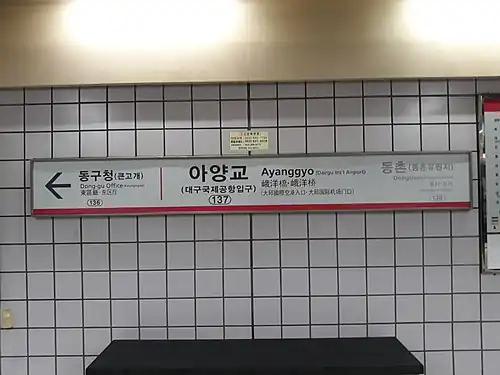 Ayanggyo Station is a station of the Daegu Subway Line 1 in Sinam-dong and Hyomok-dong, Dong District, Daegu, South Korea. It is the second deepest station of the first line, located at a place crossing the Geumho River. On 2009 March 13, an elevator was established near exit 4.[1]