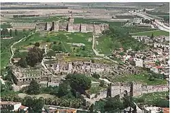 A mausoleum for St John was replaced by a basilica church on the site in the 5th century AD, but was damaged by earthquakes in the 6th century.[4] Egeria had planned to visit the church in the 4th century. It was then rebuilt by East Roman emperor Justinian the Great as a basilica in the 6th century.[4] The church was a domed cruciform basilica begun in 535/6; enormous and lavishly decorated, it was built in the same style as Justinian's Church of the Holy Apostles in Constantinople.[5][6] The basilica became one of the wonders of the medieval world, being constructed during a significant building programme which also included the Hagia Sophia in Constantinople and the Basilica of Sant'Apollinare Nuovo in Ravenna.[7] The hill's medieval Greek name, Theologos, was derived from Άγιος Θεολόγος, Hagios Theológos, 'Holy Theologian', after the Apostle's title of 'St John the Theologian'.[8] The basilica took inspiration from the nearby Temple of Artemis.