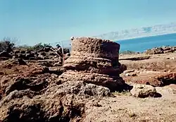 Callirrhoe is identified as the present day oasis 'Ein ez-Zara, laying on the eastern shore of Dead Sea south of Wadi Zerka Ma'in in Jordan. It was founded circa 1st century BCE and excavations between 1985 and 1989 were directed by August Strobel on behalf of the German Evangelical Institute for the Ancient Holy Land.[11][12] A villa of the 1st century CE, uncovered in recent excavations, is considered to be inspired by the designs used by Herod for his palaces.[13] Callirrhoe functioned as harbor site for the mountain fortress of Machaerus. An ancient road of 8 km length connects the two sites.[14]