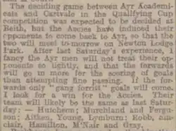 Indeed, the club never won a match in the Ayrshire Cup, but it did win through to the third round of the Qualifying Cup in 1905–06, thanks to a 4–0 win over Vale of Carrick[5] (Vale's Dunlop being suspended for kicking an Accie)[6] and a 6–0 win over Cartvale in a second replay in the second round; the Accies persuaded Cartvale to play the second replay in Ayr rather than on neutral territory.[7] The club lost 3–1 at home to eventual Qualifying Cup finalists Beith in the third, a tie in which the winners qualified for the Scottish Cup itself; Andrew Gray gave the Accies the lead, but the professionals' superior stamina won out.[8]