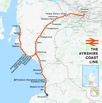 The Ayrshire Coast Line consists of lines that were formerly part of the Glasgow and Paisley Joint Railway, the Glasgow, Paisley, Kilmarnock and Ayr Railway, the Ardrossan Railway and its Largs Branch extension.