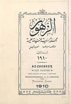 Az-Zuhur (Arabic: الزهور / ALA-LC: Al-Zuhūr / DMG: az-Zuhūr, 'The Flowers') was a monthly journal published in Cairo[1] from 1910 until 1913. Altogether, 40 issues exist. The editor Anṭūn al-Ǧumayyil (1887-1948) did already participate in the publication of the Beiruti magazine Al-Bashir and the Egyptian newspaper Al-Ahram.[2]