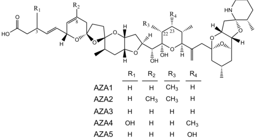 Azaspiracids (AZA) are a group of polycyclic ether marine algal toxins produced by the small dinoflagellate Azadinium spinosum that can accumulate in shellfish and thereby cause illness in humans.[1][2]