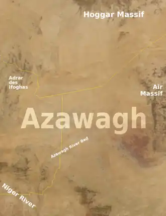 The Azawagh (alias Azaouagh or Azawak) is a dry basin covering what is today the northwestern Niger, as well as parts of northeastern Mali and southern Algeria.[1] The Azawagh is mainly made up of Sahelian and Saharan flatlands and has a population that is predominantly Tuareg, with some Arabic-speaking and Wodaabe minorities and a recent influx of Hausa and Zarma.