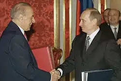 After the collapse of the USSR in 1991, relations between the two countries grew closer due to Ayaz Mutallibov's foreign policy.[5] However, after the Armenian occupation of Khojaly, Mutallibov was forced to resign which resulted in Abulfaz Elchibey coming to power. During the one-year rule of Elchibey, Azerbaijan–Russia relations were damaged. Elchibay's politics have been described as "Anti-Russian."[6] When Heydar Aliyev came to power in 1993, he reestablished warmer relations with Russia. According to President Ilham Aliyev, Vladimir Putin gave his father, Heydar Aliyev, a lasting impression, particularly in their shared KGB background.[7]