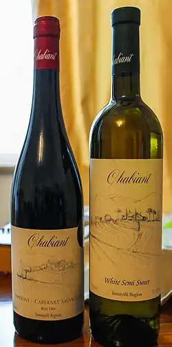 The contemporary wine-making in Azerbaijan is seen in Ganja-Qazakh and Shirvan economic zones.[38] Vineyards in these regions account to about 7% of the country's cultivated land. The regions are famous for 17 vines and 16 table grape varieties, the most common of the wine cultivars being Pinot Noir.[39] In Azerbaijan, wines made from grapes are called sharab (Azerbaijani: şərab) while wines from other fruits including apples, pomegranates and mulberry are called nabiz (Azerbaijani: nəbiz). Other sorts are called chakhyr (Azerbaijani: çaxır). According to historians, there are more than 450 different categories of wild grape found in Azerbaijan which had been used for wine-making throughout the history of Azerbaijan.[40]