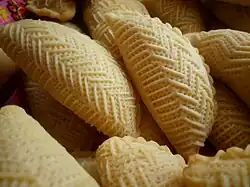 | Shekerbura | Shekerbura (şəkərbura) is a popular Azerbaijani sweet pastry, filled with ground almonds, hazelnuts, or walnuts. The ancient name for this crescent-shaped pastry is Sheker Burek, a Turkic word meaning ‘sweet patty’. In Azerbaijan, it usually involves the teamwork of relatives, friends, and neighbors who congregate at someone's home to make this. Nowruz delights. What really makes these look rather spectacular is the pattern on the dough produced by the traditional tweezers called maggash. |