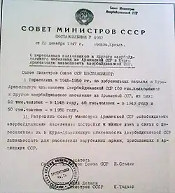 In 1947, Grigory Arutinov, then First Secretary of the Communist Party of Armenia, managed to persuade the Council of Ministers of the USSR to issue a decree entitled Planned measures for the resettlement of collective farm workers and other Azerbaijanis from the Armenian SSR to the Kura-Arax lowlands of the Azerbaijani SSR.[55] According to the decree, between 1948 and 1951, the Azerbaijani community in Armenia became partly subject to a "voluntary resettlement" (called by some sources a deportation[56][57][58]) to central Azerbaijan[59] to make way for Armenian immigrants from the Armenian diaspora. In those four years some 100,000 Azerbaijanis were deported from Armenia.[54] This reduced the number of those in Armenia down to 107,748 in 1959.[12] By 1979, Azerbaijanis numbered 160,841 and constituted 5.3% of Armenia's population.[14] The Azerbaijani population of Yerevan, that once formed the majority, dropped to 0.7% by 1959 and further to 0.1% by 1989.[57]