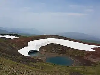 There is a lake in the crater of volcano Azhdahak that is formed from melting snow. From the top of the mountain opens the pictorial landscape of mountains Ararat, Hatis, Ara, Aragats, Lake Sevan, the whole Gegham mountains and the Kotayk valley.