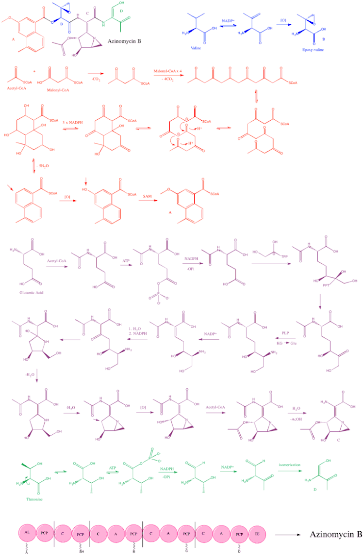 The biosynthesis of azinomycin B includes a type 1 polyketide synthase and several nonribosomal peptide synthetases.[9]