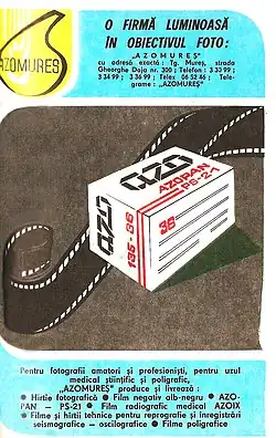 At the 15th edition of the Bucharest International Fair, organized in the Exhibition Complex in Piața Scînteii on October 14, 1989, there was also a stand for Azomureș photosensitive materials, where the products were presented: AZO-X orthochromatic medical radiographic film, industrial radiographic film for nuclear use Gamagraf NG1, NG2, NG 3, negative color film Azocolor 100.[12]