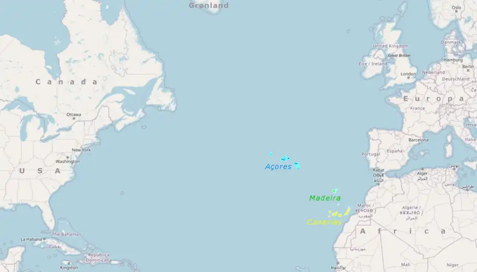 The Azores (/əˈzɔːrz/ ə-ZORZ, US also /ˈeɪzɔːrz/, AY-zorz;[7][8] Portuguese: Açores, Portuguese pronunciation: [ɐˈsoɾɨʃ] ⓘ), officially the Autonomous Region of the Azores (Região Autónoma dos Açores), is one of the two autonomous regions of Portugal (along with Madeira). It is an archipelago composed of nine volcanic islands in the Macaronesia region of the North Atlantic Ocean, about 1,400 km (870 mi) west of Lisbon, about 1,500 km (930 mi) northwest of Morocco, about 1,930 km (1,200 mi) southeast of Newfoundland, Canada, and the same distance southwest of Cork, Ireland.