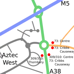 ![]() Major roads and bus stops near Aztec West | |